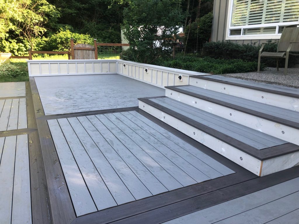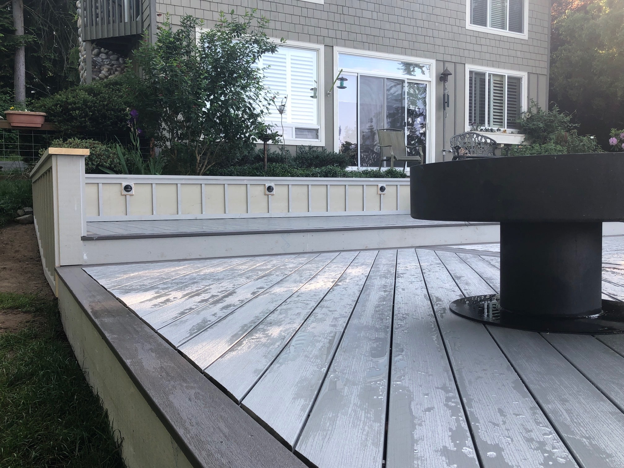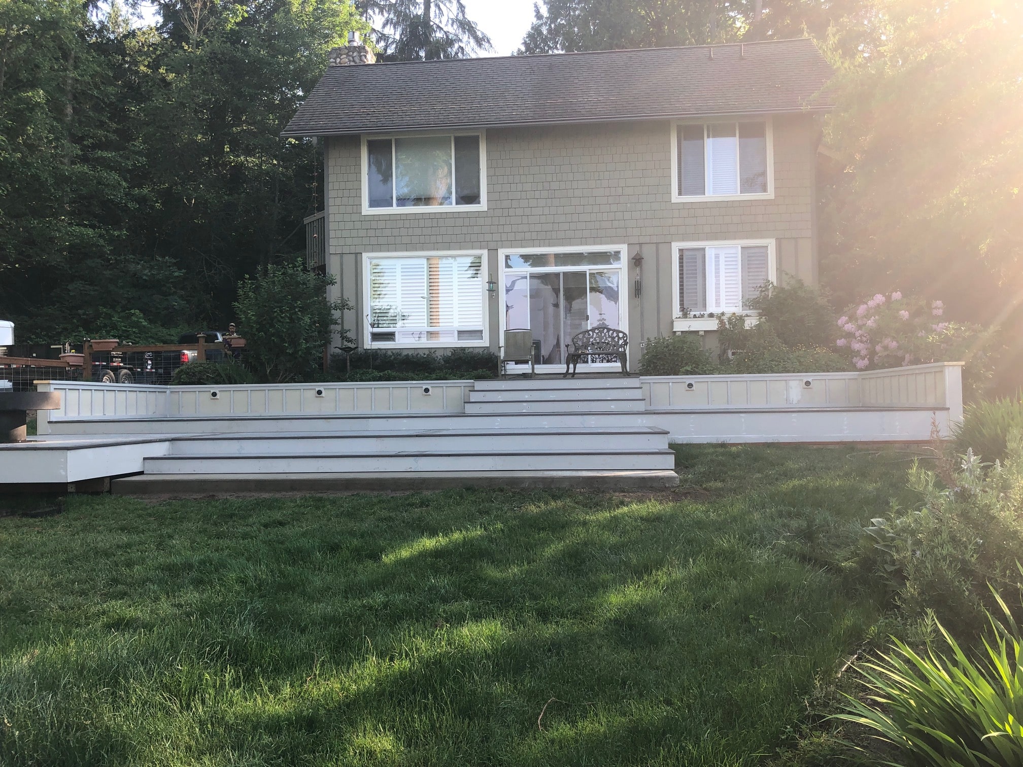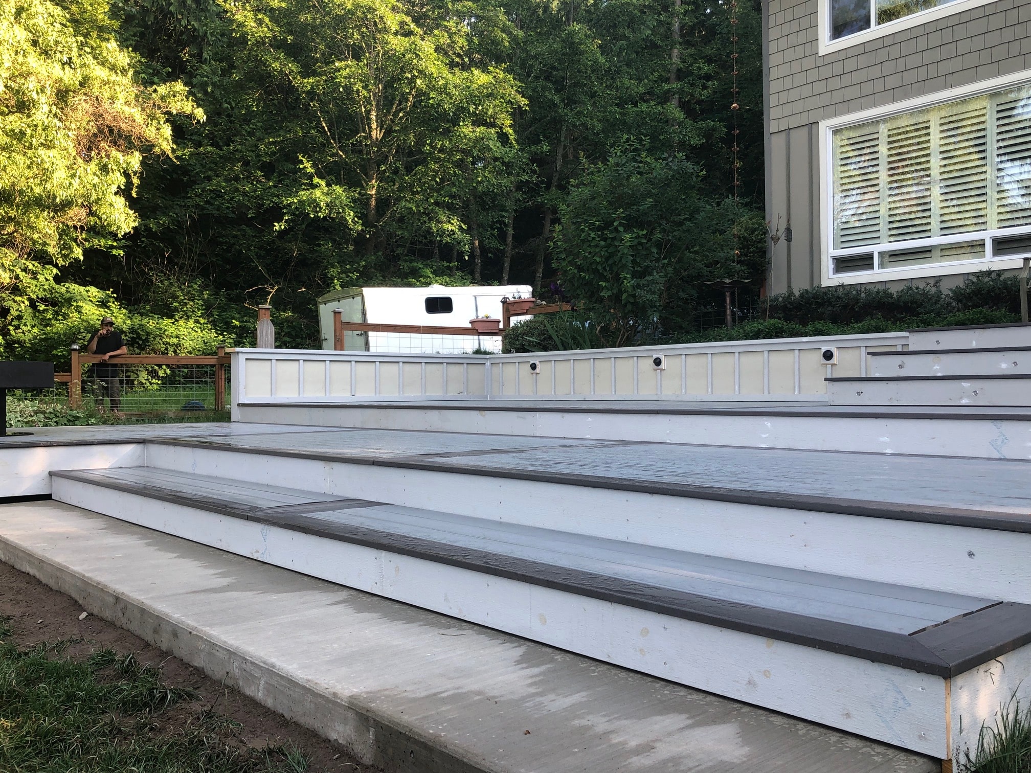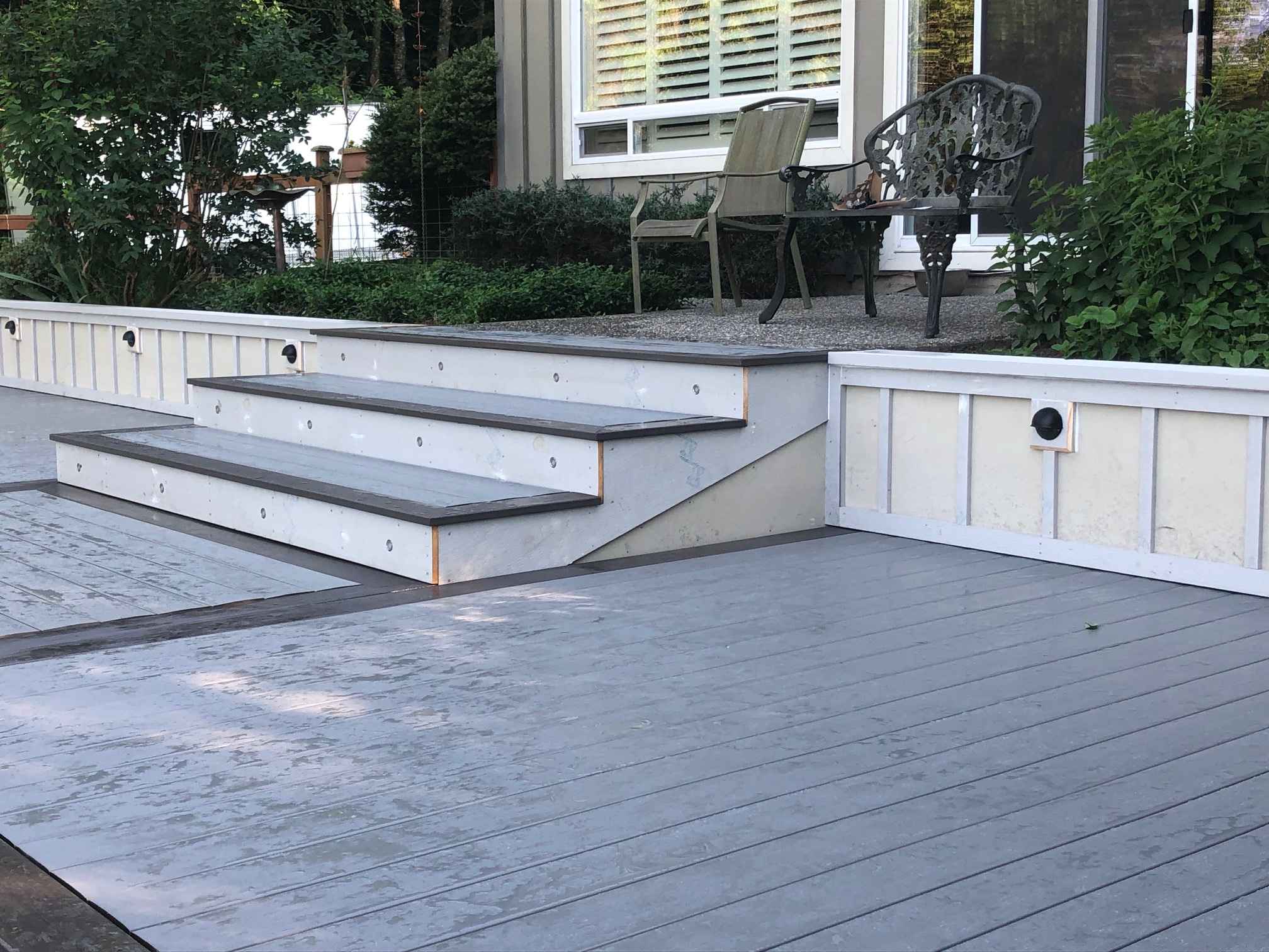 This deck project consisted of removing the old deck, old retaining wall and rebuilding a new retaining wall using tiebacks. This deck build also includes custom lighting up the stairs and retaining wall.